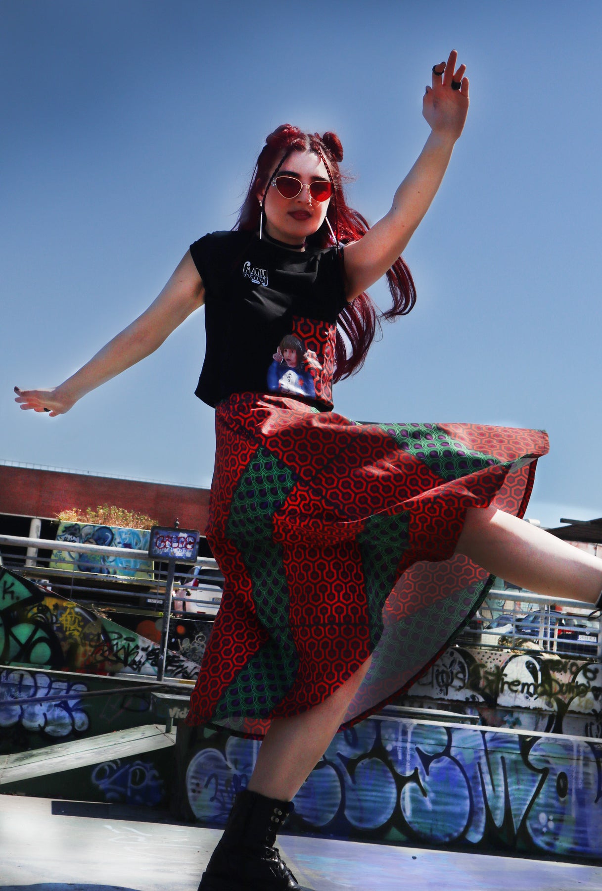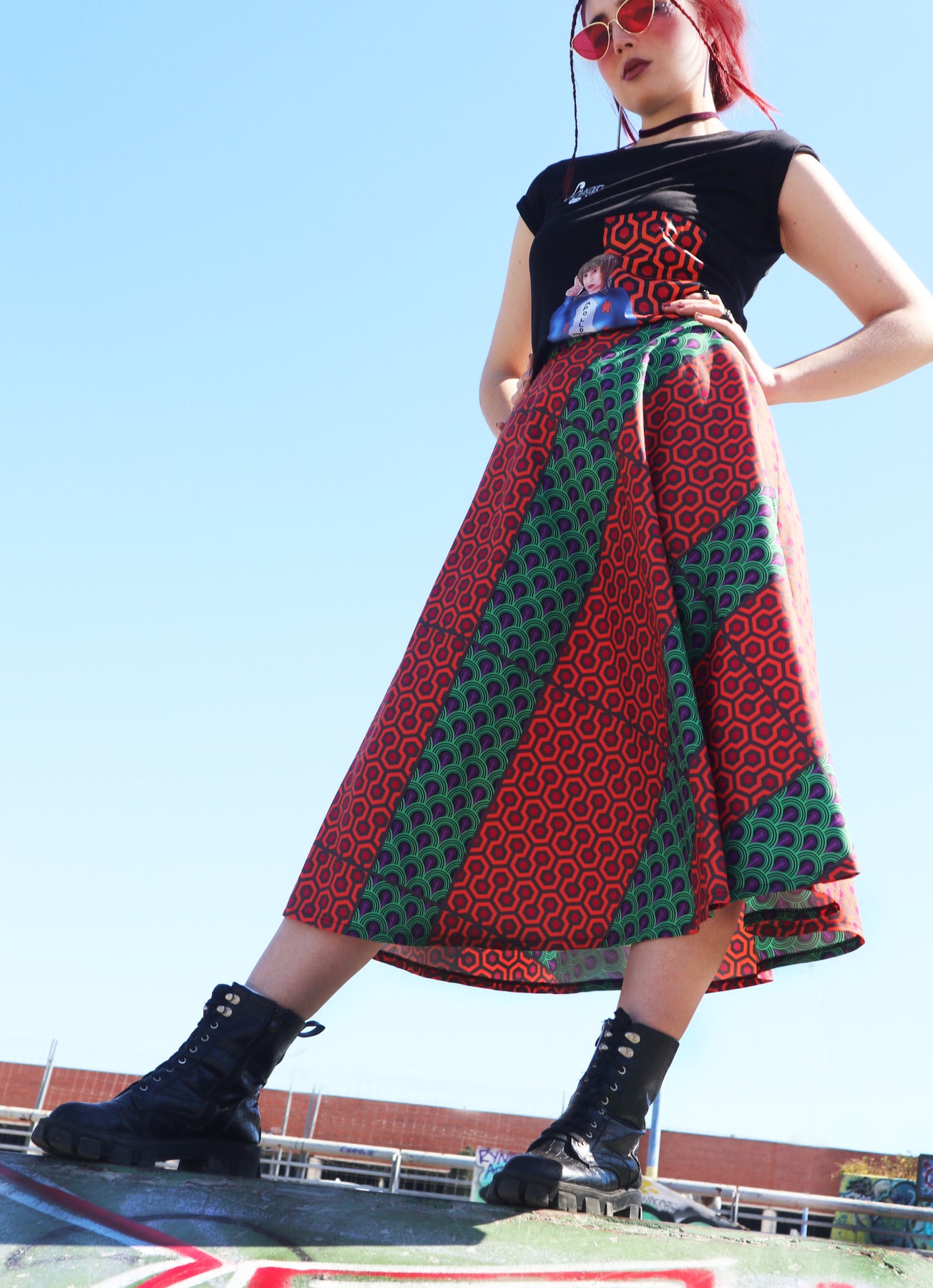 El cine y la moda se fusionan en esta falda única con estampado inspirado en El Resplandor. Su diseño evoca la estética del filme, con colores y patrones que rinden homenaje a la obra de Kubrick. Hecha a mano con materiales de alta calidad, esta prenda es perfecta para quienes buscan un look audaz, cinéfilo y fuera de lo común. Ideal para quienes aman el terror y la moda con personalidad.