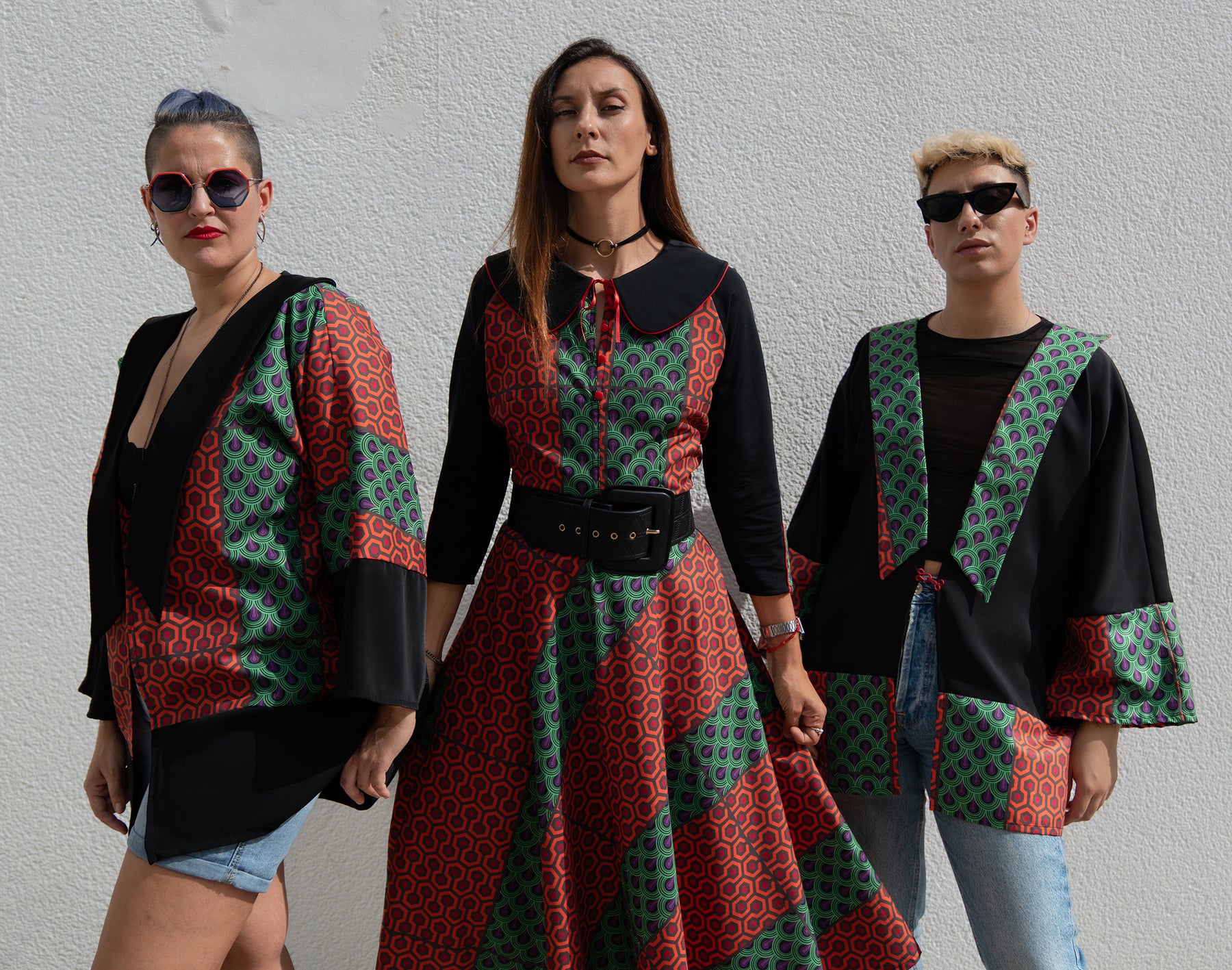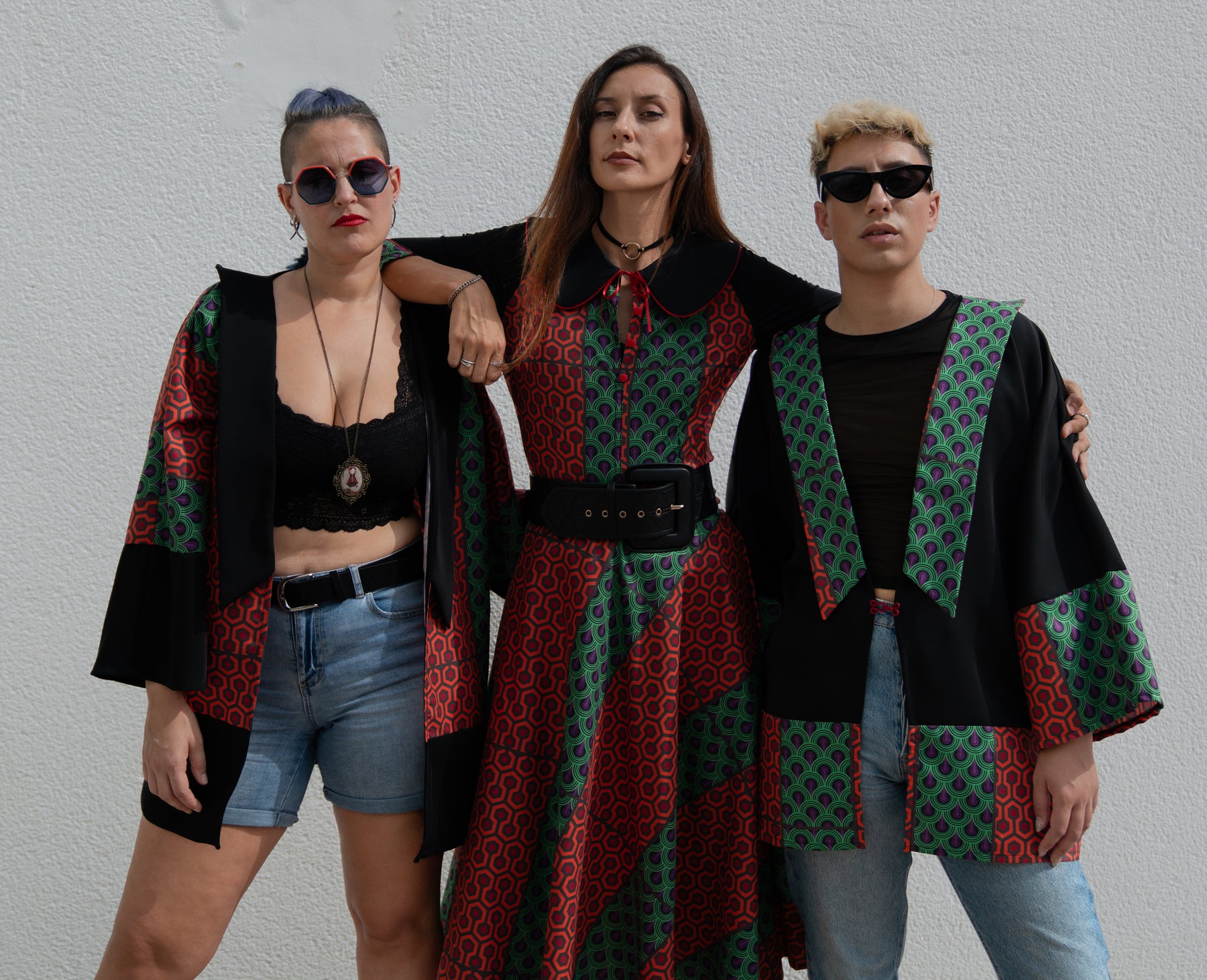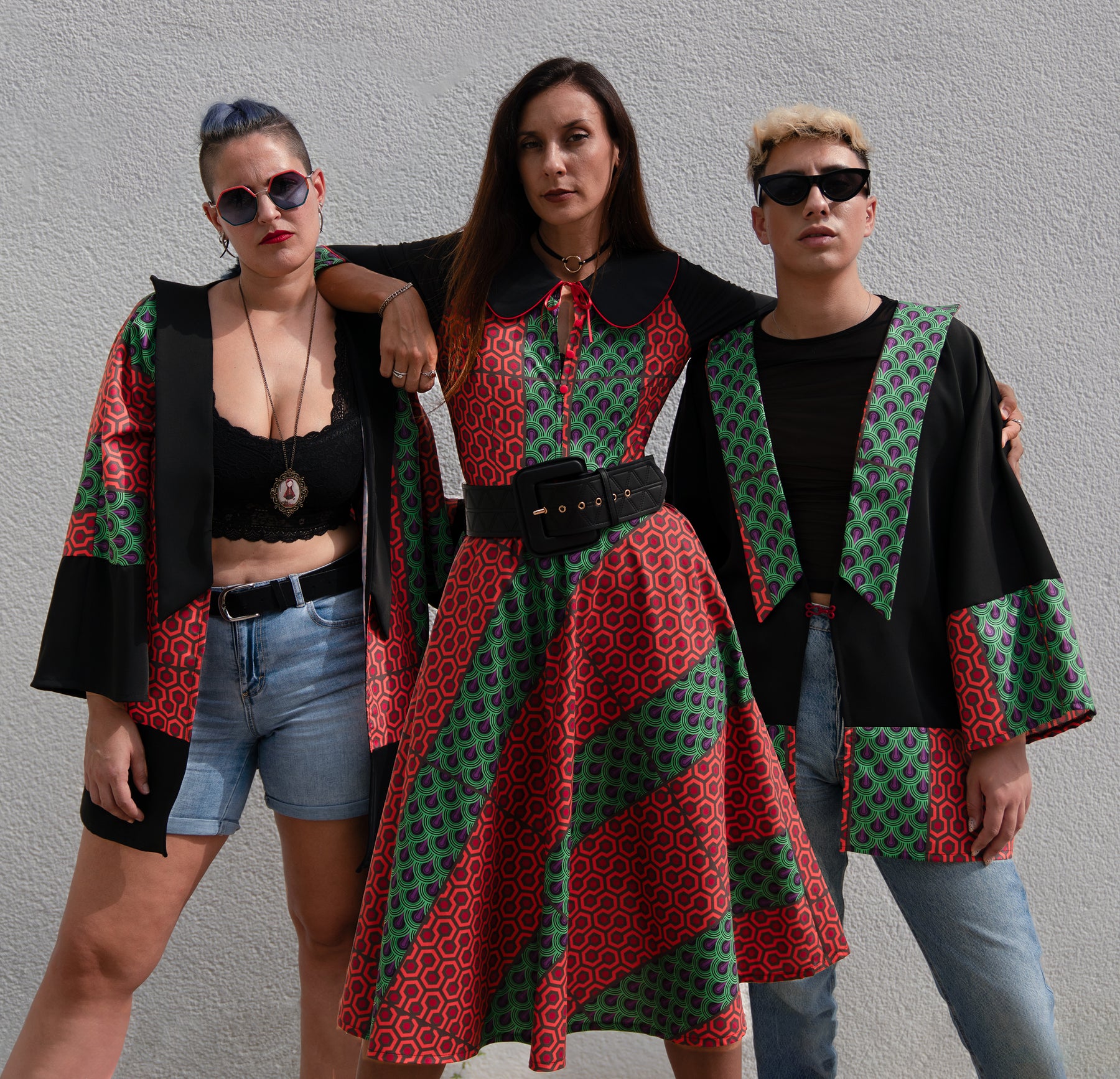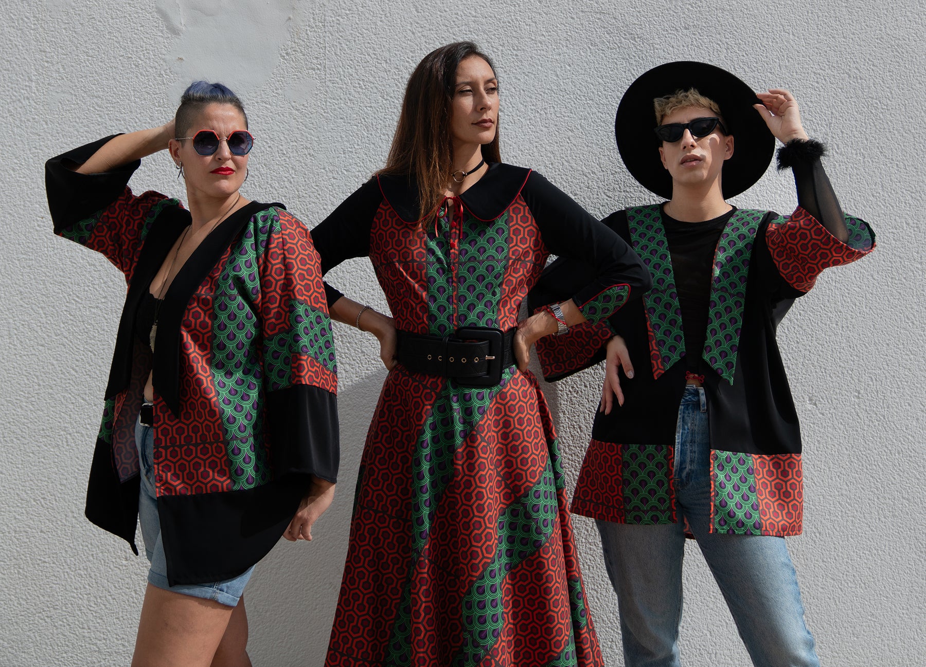 Este kimono fusiona la estética hipnótica de las alfombras vintage con los inquietantes elementos de la icónica habitación 237 de El Resplandor. Su estampado crea una cuadrícula visual intrigante, donde patrones geométricos y detalles simbólicos se combinan para una presencia única y envolvente.
